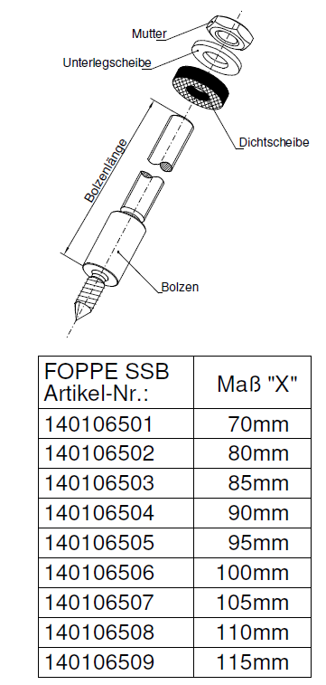 Stk. Bolzen, Dichtungsring, Unterlegscheibe und Mutter (die von uns angegebenen